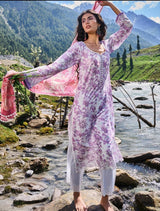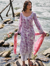 Bold and whimsical flowers in tones of purple and pinks are artistically crafted to create ‘Sasha’. Paired up with a contrasting dupatta in quirky orange, tangerine and pinks. The perfect ensemble to beat the summer heat.