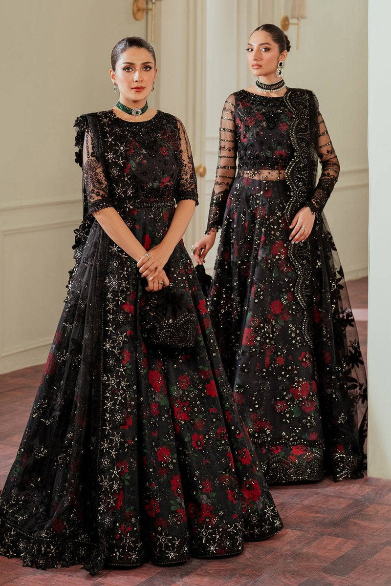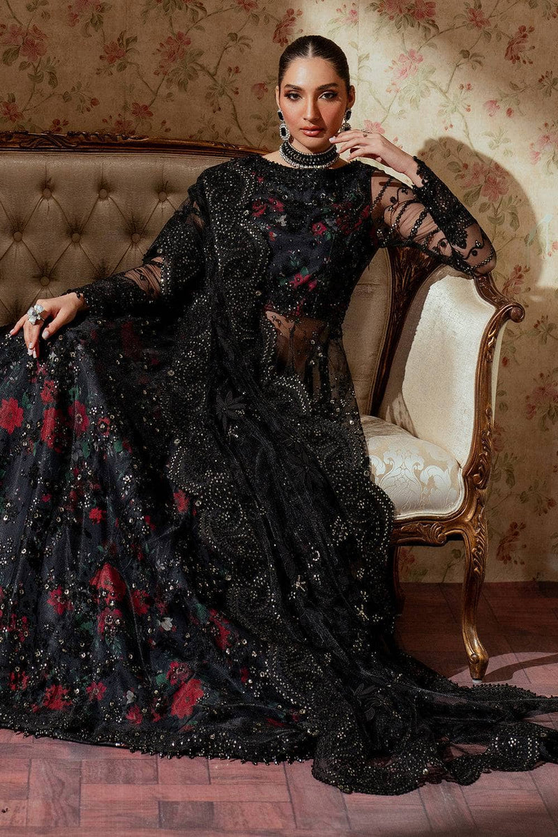 The net sleeves are embroidered with black threadwork enhanced by silver sequins. Moreover, the overall outfit has digital floral printed silk lining visible through the net creating a luxurious texture.