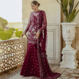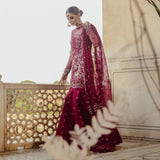 A wine color net shirt is composed in embroidered and embellished floral and leafy stalks of lilies,pensys and irises. A heavy jewelled neckline is set in pearls and crystals to make a statement with wine color satin sequins border in feathery and floral details on hem.