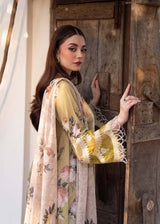 The Zarnish outfit showcases a printed lawn shirt with an embroidered neckline patch, embroidered sleeves patch on organza, and an embroidered daman patch on organza, adding a delicate touch of elegance. The ensemble is paired with a plain dyed straight cambric trouser with an elasticated waistband for a comfortable fit. Completing the look is a printed chiffon dupatta that enhances the overall aesthetic.