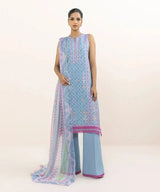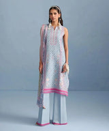 Make a statement with our three-piece embroidered ice blue and multicoloured ensemble, featuring a linen jacquard shirt paired with a crinkle chiffon dupatta and cotton trousers.