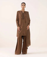 Make a statement with our three-piece embroidered brown ensemble, featuring a dobby shirt paired with an extra-weft jacquard dupatta and cotton trousers.