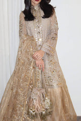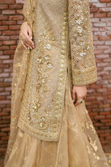 A stunning skin-toned jacket, exquisitely adorned with intricate embroidered jaal and delicate 3D floral motifs, finished with a shimmering pani border for a subtle touch of glamour. It is paired with a beautifully screen-printed organza sharara featuring a pani border, and a sequin sitara–embellished dupatta blooming with soft florals. Together, the ensemble radiates ethereal grace and modern regal allure.