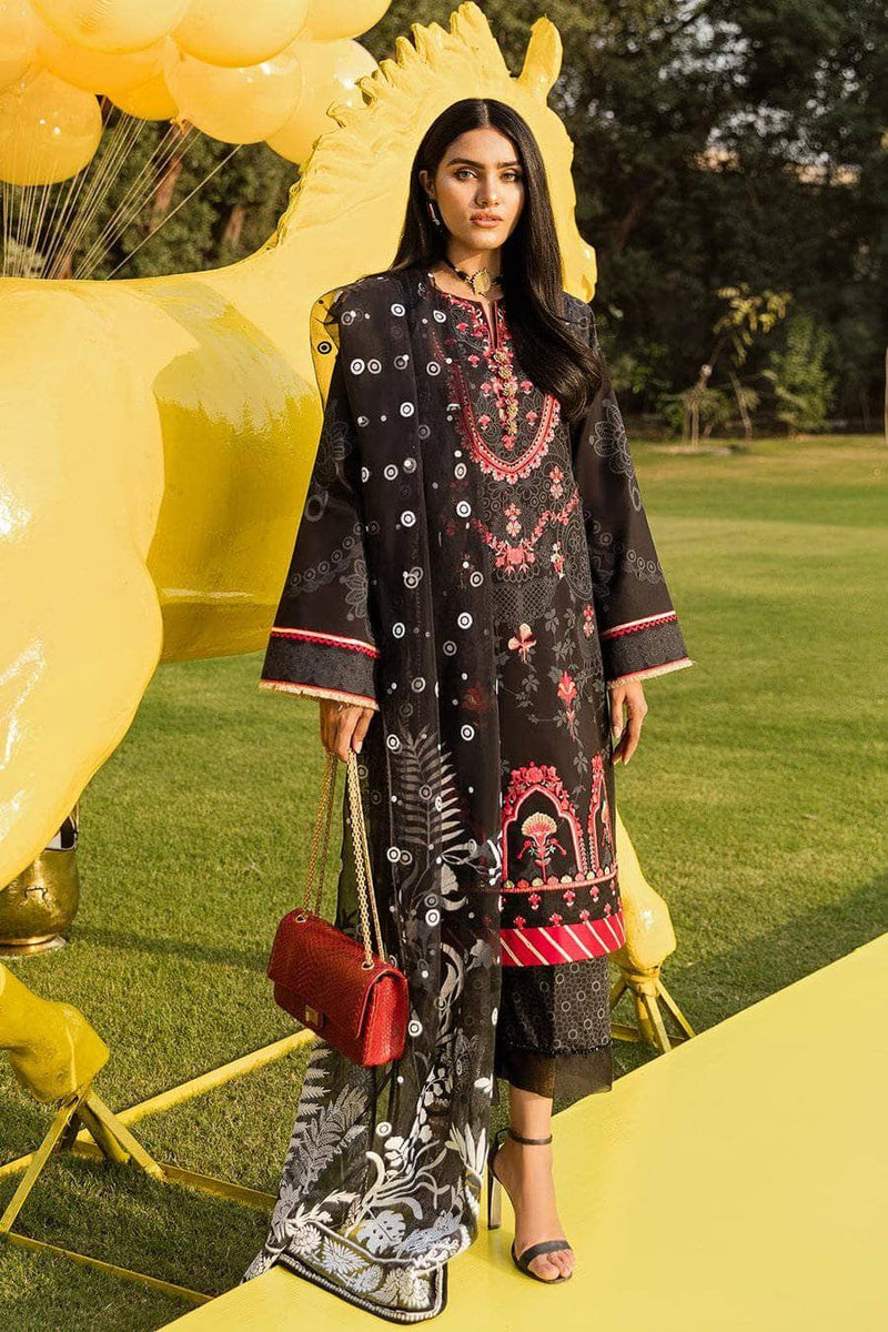 As beautiful as the name suggests, Kashmir ki Kali is created with a lot of diligence and love invested in it. A classic black colored ensemble with a very elaborated floral print and an embroidered front including a touch of refreshing ruby red to compliment the base with an embroidered daman and a daman border to enhance the extravagance paired with a flock printed organza dupatta and dyed pants.