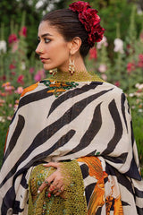 Tulsi is our parrot green-hued festive lawn ensemble. The shirt is extravagantly adorned with an architectural design element and floral motifs. The neckline features signature Mughal architectural motifs and botanical illustrations in miniatures done beautifully in contrasting shades of sapphire blue and white. The dupatta is printed in an exotic zebra print featuring a spray of eclectic motifs and featuring a decorative trim across all sides. The ensemble is paired with a white gharara featuring delicate eyelets/chikan work across the hem.