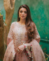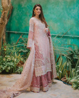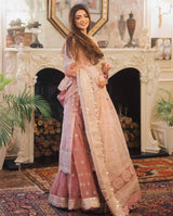 Introducing the exquisite 'Arezoo' ensemble in the enchanting shade of Rose Milk Pink. This ethereal creation features an organza embroidered-embellished shirt with a dark pink hem patch, accentuated by an embroidered-embellished satin silk hem border adorned with twin sequins. The sleeves are a work of art in themselves, showcasing two different organza patches and satin silk border, beautifully embroidered and embellished.The ensemble is elegantly completed with an organza dupatta, featuring two distinct pallus – one in darker pink organza and the other adorned with intricate embroidery on satin silk, along with an alluring four-sided border. The matching gharara, designed in organza with a satin silk finishing border, adds a touch of sophistication and grace to this breathtaking 'Arezoo' ensemble. A perfect choice for brides seeking timeless beauty and sheer elegance.