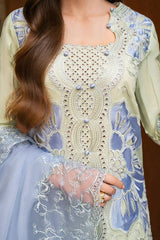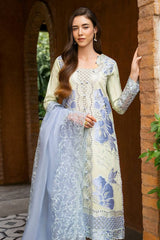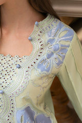LADY BUG is a stunning vision of luminosity, featuring a luminous lemon-colored net shirt and cotton trouser fusion paired with a breathtaking light blue organza dupatta. The shirt boasts exquisite floral embroidery and is detailed with an organza patch on the sleeves that adds an extra touch of elegance.