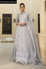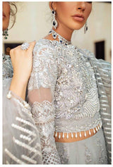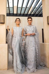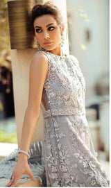 A gray tulle canvas is embroidered in a subtle monotone array of floral bunches with sequins and pani. A gorgeous heavily embroidered border complete the design along with an embroidered and handworked bodice. Paired with a gracefully crafted tulle dupatta with sequins and pani scallops, this design can be stitched as a lehnga choli, a floor length pishwaas or an open shirt.