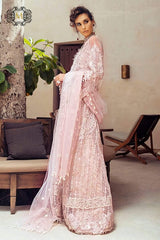 A sheer pink tulle shirt, heavily embroidered and handworked with sequins, pani, seed pearls, naqshi, Swarovski and stones, is further enhanced with a detailed neckline enhanced with delicate fur. Paired with a gorgeous pani embroidered dupatta and dyed silver rosewater jamawar lehnga, this design is ethereal and classy. Stitched as a short shirt with loose sleeves or a floor length shirt, this will certainly grace every festive occasion this year.
