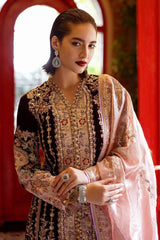 Embrace elegance with "Sentimental Journey" - a stunning blend of rich velvet and intricate embroidery, sequins, and hand embellishments. Paired with raw silk trousers and adorned with golden naqshi balls, this ensemble is perfect for creating unforgettable moments.
