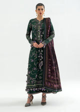Radiating timeless elegance, this dark green long khaddar shirt features a stunning lavender traditional neckline and a delicate floral jaal cascading down the center. The design is elevated with a beautifully composed heavy hem and intricate borders, while chintz -inspired sleeves add a touch of artistic charm. Paired with a matching bordered culotte and a printed deep purple wool shawl adorned with traditional floral patterns and finished with printed facings — this ensemble captures the essence of heritage with a modern, graceful allure.