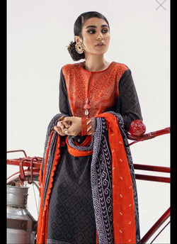 Experience this fun and modern chic kurta with a beautiful tie and dye chunri design in raven and burnt orange. Coupled with a stunning khaddar dupatta.