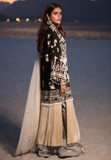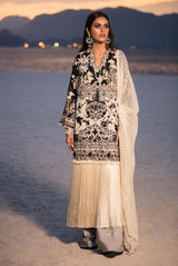 A black and beige lawn shirt featuring scenery and tile work motifs, with a contrasting embroidered lawn daman and printed sleeves and back. Paired with a cream and beige embroidered dupatta and monochrome pants.