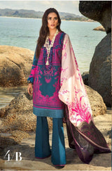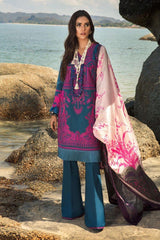An ethnic and floral Oxford blue lawn shirt with pop pink embroidery, digitally printed set sleeves and back. Paired with a digitally printed silk dupatta in pastel and pop pinks and Oxford blue dyed cotton pants.