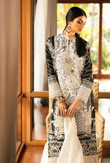 A lace inspired black and cream lawn cut-work shirt with paste printed sleeves, paired with dyed cotton paste printed cream pants and a cream on cream embroidered gauze dupatta.