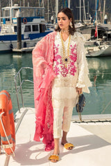 A cream dobby shirt with cream cut-work and pink embroidery and paste printed sleeves and back in lace and floral motifs. Paired with a pop pink and cream embroidered tulle dupatta and cream paste printed pants.