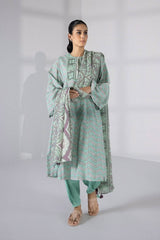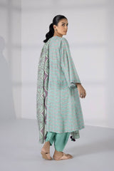 Adorn mint hues with this three-piece khaddar ensemble featuring geometrical patterns.