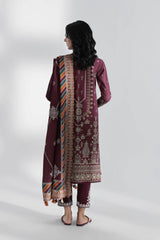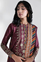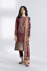 Adorn grace with this maroon hued embroidered khaddar three piece ensemble featuring printed blended shawl and trouser.