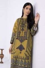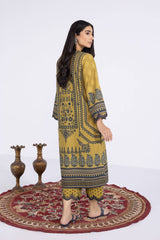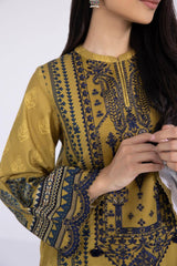 Elevate your everyday style with this yellow hued printed embroidered khaddar two piece ensemble.