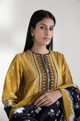 Look regal with this yellow hued embroidered khaddar ensemble featuring matching trouser and printed blended black shawl.