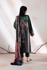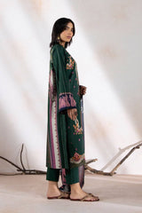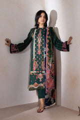 For an elevated look style yourself with this green hued linen ensemble featuring embroidered front shirt and multi colored printed dupatta.
