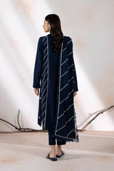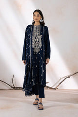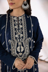 For a contemporary look, style yourself with this dark blue hued linen ensemble featuring embroidered front and dupatta.