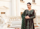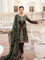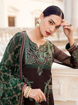 Fabric: Deep bottle green covering the dark brown base in aesthetic embroidery creating a unique combination. Shirt Front: Embroidered Chiffon Shirt Back: Dyed Chiffon Sleeves: Embroidered Chiffon Dupatta: Embroidered Chiffon Dupatta Pallu: Embroidered Chiffon Sleeves Lace: Embroidered Silk Front & Back Lace: Embroidered Silk Trouser: Dyed Raw Silk |
