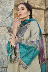 Fabric: Jacquard front 1.25m Jacquard back 1.25m Jaquard sleeves 0.67m Printed sleeve patti 1m Embroidered neckline 1piece Embroidered ghera patti 1m Embroidered sleeve patti I 1m Embroidered sleeve patti II 1m Printed trouser 2m Printed silk dupatta 2.5m |