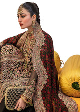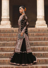 Haqeeqat – this black chiffon outfit is an epitome of perfection, donned with beautiful foliage motifs embroidered in shades of green, pinks, orange and reds. Paired up with black sharara and printed scalloped dupatta.