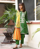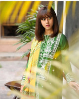 A verdant green canvas is heavily embroidered with intricate ivory tribal details in 'Bisha.' Paired with a beautifully rendered printed dupatta in lively hues of daffodil & grapefruit, and a monotone trouser, this deep hued ensemble will make a great style statement this summer!