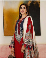 Elegance meets extravagance. This cherry red shirt comes in a dobby fabric and a deep blue base neckline that’s embroidered with a blend of brown, cream and ferozi resham. Traditional designs meet elegant Turkish inspired motifs over the neckline. Paired with a digitally printed tussar silk dupatta, layered with Kashmiri style paisleys in beige, red, blue and orange along with matching cotton cherry red pants.