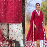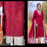 Additional Description: Immerse yourself in the Summer romance where delicate floral motifs and chicken embroidery dance in tune on a luxurious scarlet canvas kissed with delicate mirror work framing each panel. The refined detailing of cutwork on the daman reflects true craftsmanship. Paired with a flowy chiffon dupatta exquisitely framed with dainty flora embroidery on the lengths and the pallu is composed in floral motifs creating gorgeous concentric frames. The pants are a contrasting ivory canvas embroidered with scarlet rosettes. -
