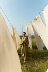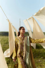 This olive green embroidered shirt, is paired beautifully with a solid shalwar and a printed shawl.