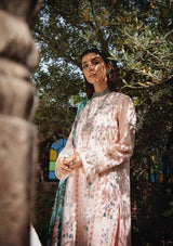 A staple for #AIKSaviorFaire, the traditional House all over embroidery design in blush pink with cool toned accents giving it a relaxed breezy vibe. This theme is extended on the digital print dupatta making this Look the perfect summer attire.