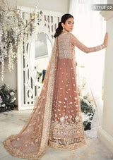 A muted rosewood tulle canvas features artistically laid out ivory and gold threadwork. With a booti jaal bodice complemented by the gliding floral garlands, the Look is fashioned in two equally captivating styles.