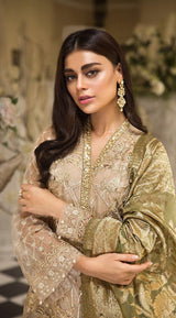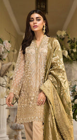 Fabric: Organza Jacquard Dupatta: 2.5M Embroidered Organza Shirt Front: 1Yard Embroidered Organza Shirt Back: 1Yard Embroidered Side Panels: 0.33M Embroidered Sleeves: 0.67M Hand-embellished Gota-sequinned neckline: 1PC Embroidered Front Daaman: 0.75M Embroidered Back Border: 0.75M Embroidered Trouser Border: 1M Raw Silk Trouser: 2.5M |
