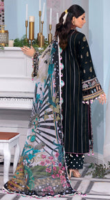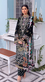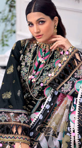 Haniya’ features a rich sooty canvas abundantly adorned with a mesmerising wild floral tapestry exquisitely detailed in multihued threads of sage, moss green, blush rose, lemon and ivory effortlessly blooming on it. Accompanied by an artistically printed silk dupatta featuring a play of eccentric and ornamental motifs and a printed trouser, this look festive chic at its very best.