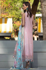A powder pink lawn shirt, inspired by Bua Blossoms, boasts intricate schiffli eyelets on its front and an exquisite display of embroidered motifs on its back. The neckline, sleeves, and shirt borders are elegantly adorned with pastel-hued scalloped embroidery on pure organza, using satin stitch and French knot techniques. The ensemble is perfectly complemented by a digitally printed iced blue chiffon dupatta, featuring imagery of rosettes, geometric borders, and linear florals that echo the delicate shades of pink, green, ivory, and buttercream, reminiscent of the lush floral landscapes of Thailand.