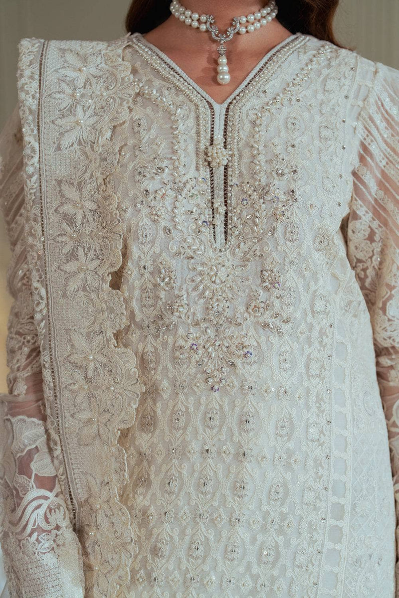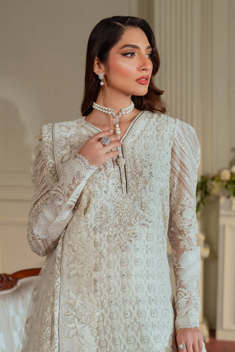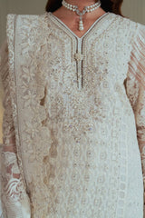 The outfit is completed with a luxurious net dupatta, bordered with white on white embroidery, which drapes beautifully, enhancing the outfit’s overall grace. The dupatta, adorned with intricate embroidery, perfectly balances the ensemble's richness and adds an ethereal quality.