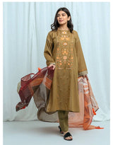 1.14 Mtrs Summer Karandi Embroidered Front, 1.14 Mtrs Summer Karandi Back , 0.5 Mtrs Summer Karandi Embroidered Sleeve, 2.5 Mtrs Digital Printed Karandi Net Dupatta