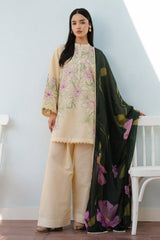 A serene beige base comes to life with bold lilac and green embroidery, creating a harmonious balance of floral elegance.
