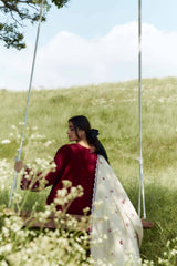 This red shirt is the perfect pop of color for fall. It pairs beautifully with a solid shalwar and an embroidered shawl.