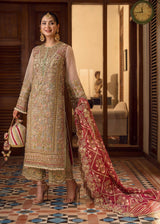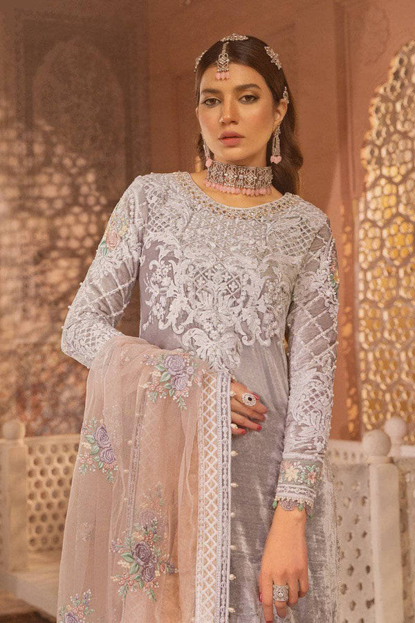 The fifth look features our signature naqshi marori which is encrusted with ada worked micro pearls, crystals and gota on a beautiful mint base. The dupatta is printed in the prettiest bunches of hydrangeas and flanked with chata patti pallus in beautiful pastels. The gold foil printed lehnga in a custom Shikargah pattern finishes the outfit beautifully.