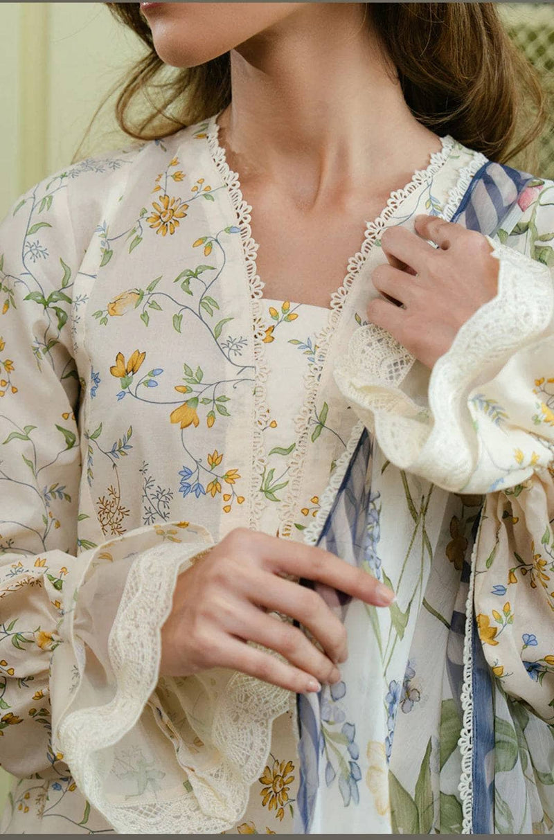 Get ready for summer with the IVORY AURA-3 PC LAWN PRINTED SUIT. Its cool lawn printed shirt and cambric printed trouser will keep you comfortable all day. And with 40 embroidered patti on sleeves and trousers, you'll stay stylish. The chiffon printed dupatta adds the perfect finishing touch.
