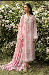 This MEADOW MIST-3PC PRINTED LAWN SUIT features a beautifully designed lawn shirt with embroidered applique on the front, printed and embroidered sleeves, and a printed back. The cambric dyed trouser and silk printed dupatta add a touch of elegance to the suit. Perfect for any occasion with its unique design and comfortable fabrics.