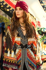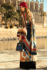 Fabric: This contemporary print exudes the majesty of the Cathedral de Mallorca standing tall in the background. The regal design, rendered in jewel tones of blues and reds features a blend of ornamental details in a striking chevron pattern and is accompanied by a vividly illustrated silk dupatta. |