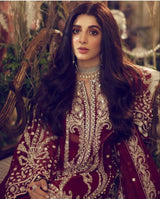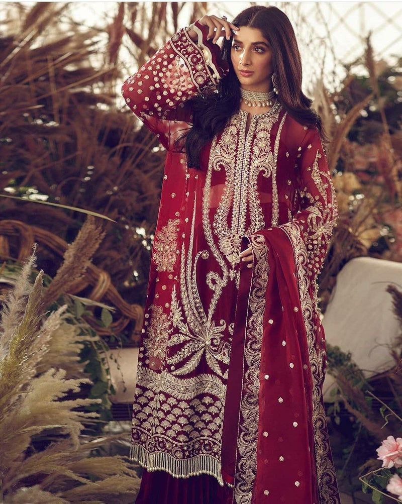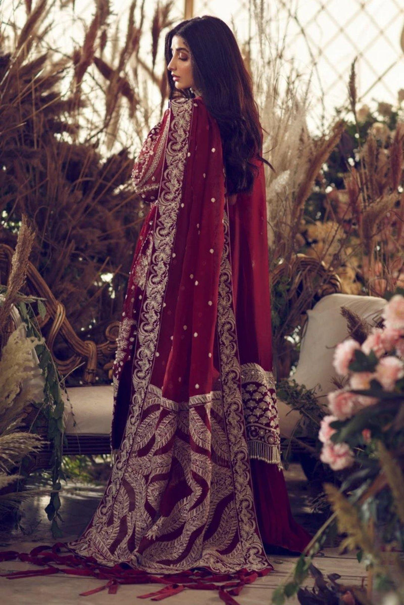 With intricate ivory embroideries, inspired by a unique blend of eastern ornamentation and european regalia, on a deep carmine organza silk canvas this soulful design features silver hand embellishments using fine sequins, sparkling crystals and glistening gota. It is accompanied by a richly embroidered dupatta and a raw silk trouser to complete this swoon worthy ensemble.