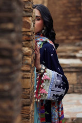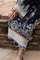 Introducing “Mahrosh”—a sublime union of opulence and tribal artistry. The deep midnight blue fabric serves as a luxurious canvas, adorned with intricate ivory embroidery inspired by ancient tribal motifs. Each stitch is a testament to meticulous craftsmanship, exuding strength and sophistication in a breathtaking visual masterpiece.