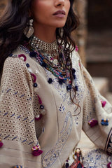 Introducing ‘Arsia’—a luxurious masterpiece that effortlessly blends bohemian artistry with the refined elegance of winter. The rich, warm beige canvas is elevated by the earthy sophistication of intricate tribal embroidery. Delicate motifs in ivory, frost blue, and florentine are meticulously crafted, telling a timeless story of craftsmanship that seamlessly merges the essence of winter with free-spirited allure.Paired with a contrasting printed silk dupatta, this ethereal ensemble strikes the perfect balance between modernity and tradition.