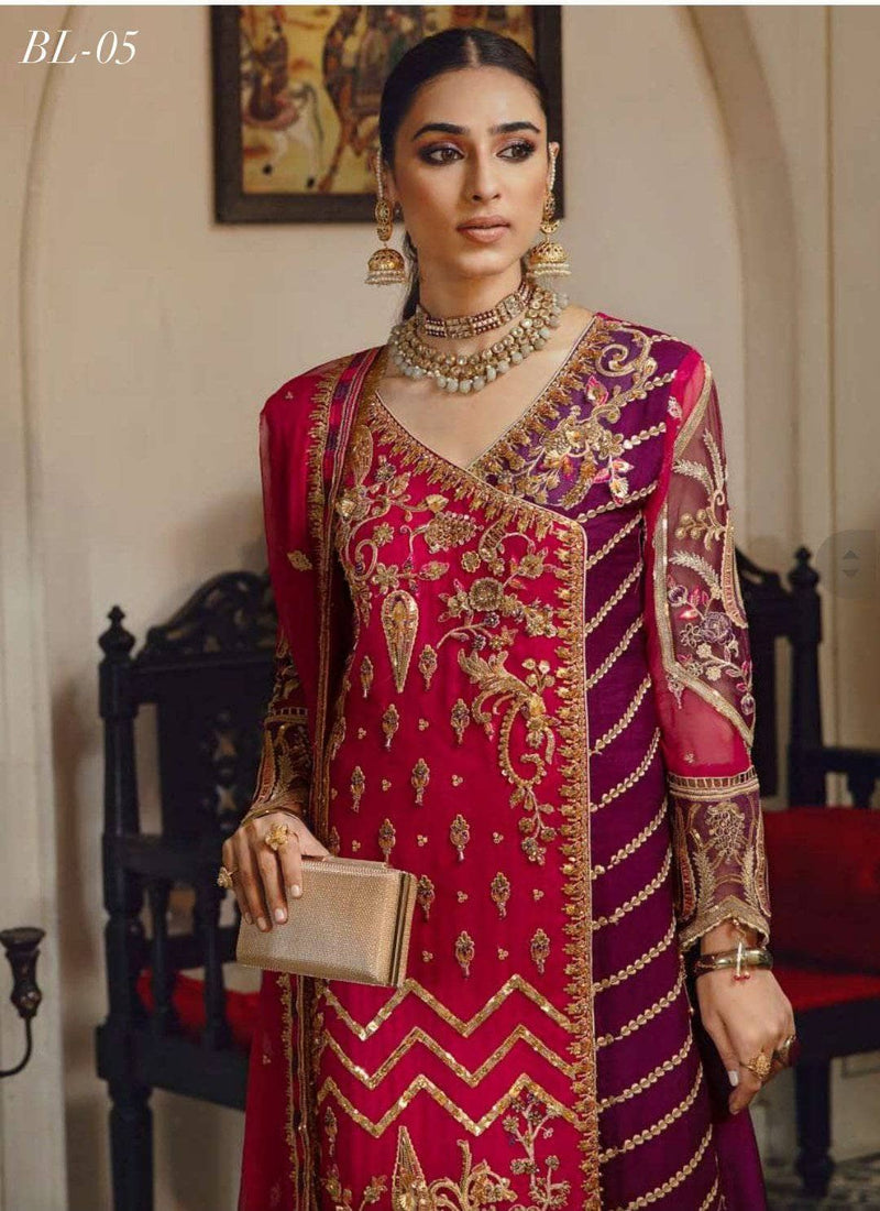 Chiffon Embroidered Hand Made Front Right Side Organza Embroidered Hand Made Front Left Side Neck Line Chiffon Embroidered Front Left Side Chiffon Embroidered Back Chiffon Embroidered Sleeves Patches Chiffon Fabric For Sleeves Chiffon Embroidered Dupatta Organza Embroidered Front, Back And Sleeves Border Shamose Silk Embroidered Trouser